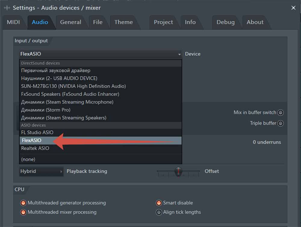 Backend — Здесь выбирается звуковой движок (аудио-система), через который FlexASIO будет работать.