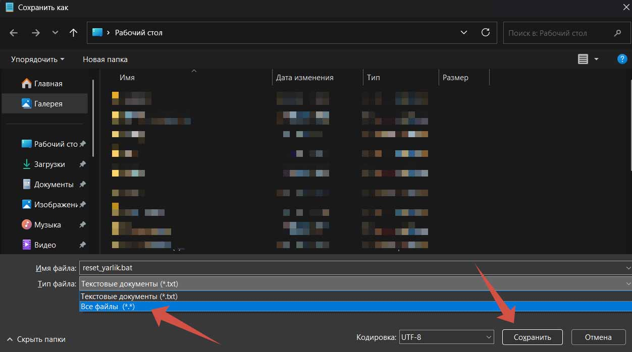 2) Далее сохраните файл с произвольным названием но с расширением .bat, в любое удобное место на диске